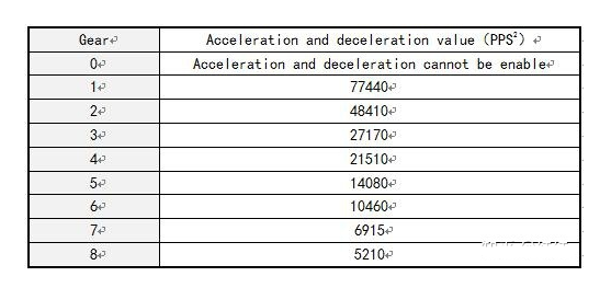 如下圖圖示,42mm兩相混合式步進(jìn)電機(jī)系列系統(tǒng)總線中小型步進(jìn)電機(jī)控制器的加加減速機(jī)時間分八個級別,各自相匹配1-8的加降速指數(shù),標(biāo)值越倍加減速時間越長