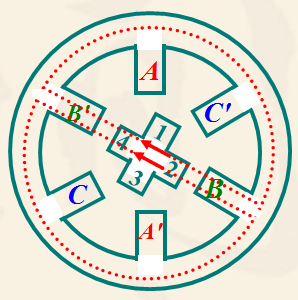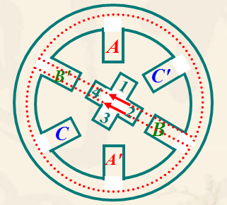 所以轉子轉到兩磁拉力平衡的位置上。相對AA' 通電,轉子轉了15°。